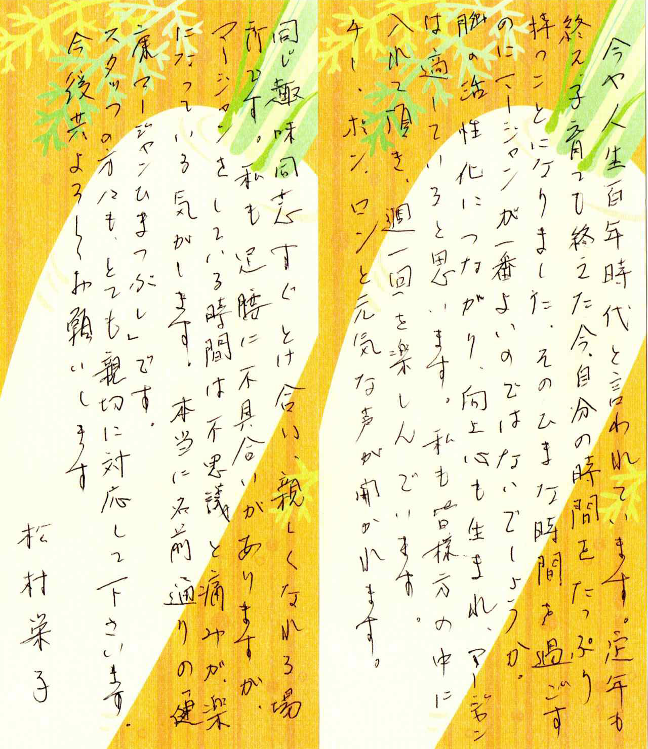 長年教育の現場で活躍され、現在は「人生100年時代」を前向きに楽しんでおられます。健康マージャンひまつぶしには週1回参加され、仲間との交流や脳活に励む元気な常連さんです。普段の会話では息子さんのお話がよく登場し、先日は「箱根旅行に連れて行ってもらったんです」と嬉しそうに語ってくださいました。親孝行な息子さんがご自慢の、明るく温かいお母様です。